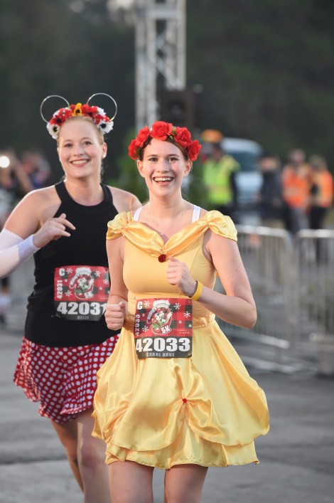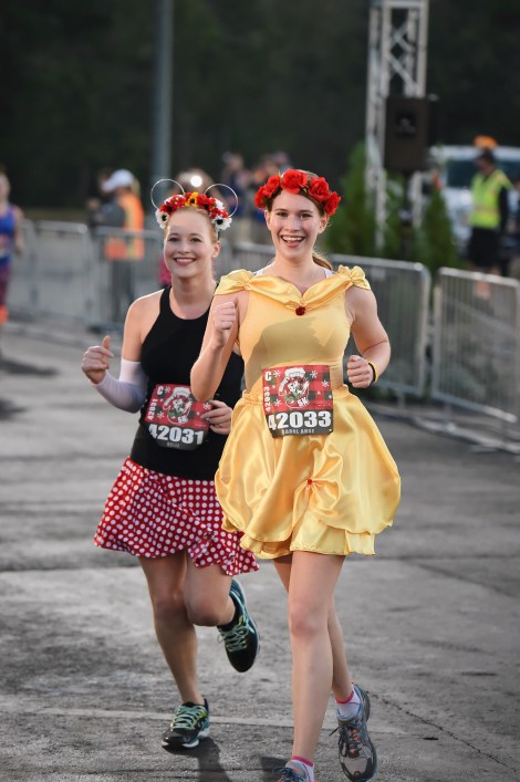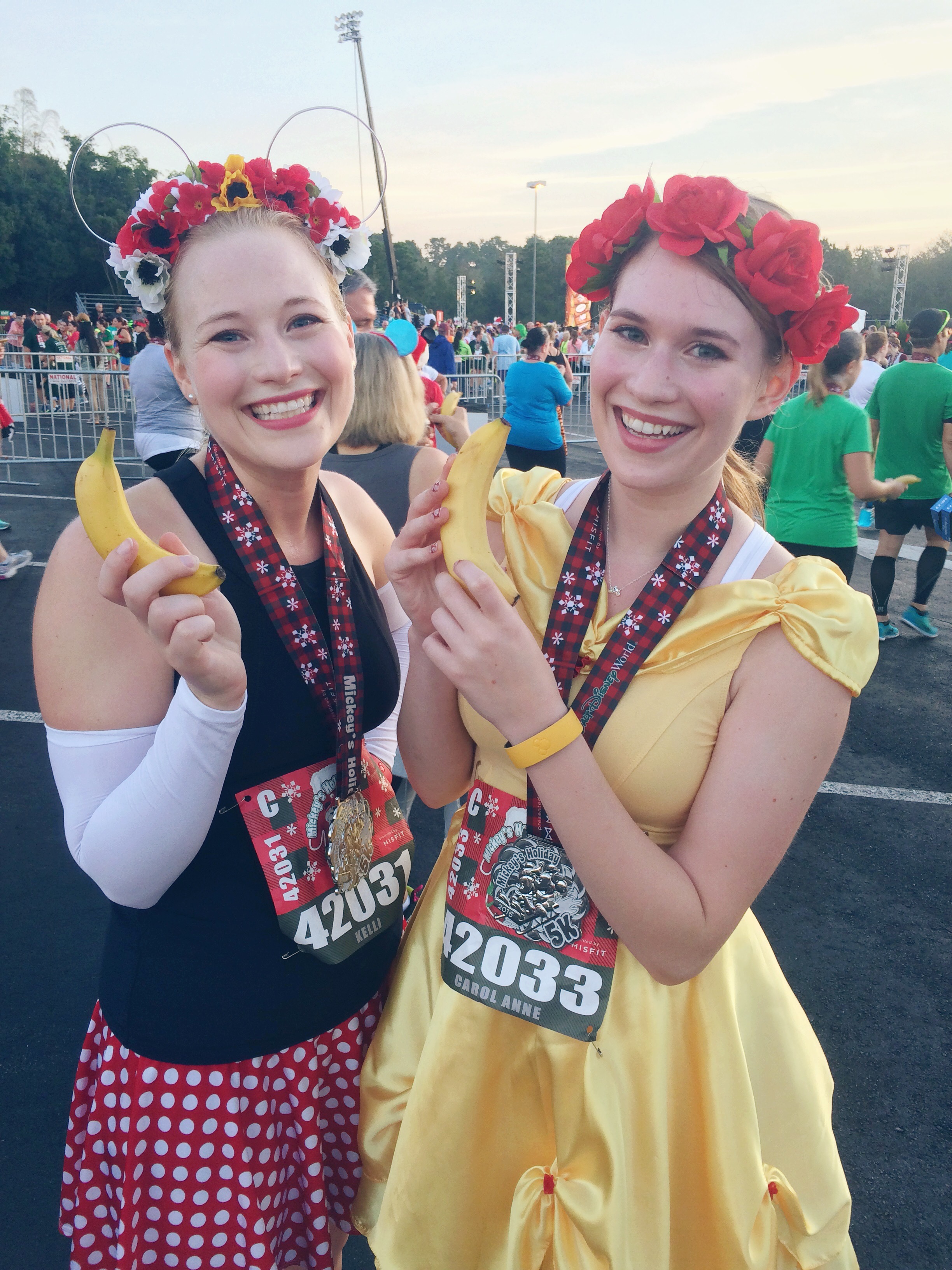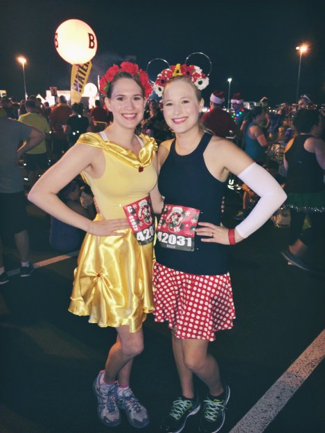 Since it’s RunDisney, running in costume was an absolute MUST for both Carol Anne and I. Approximately 70% of the participants ran in costume; most of them holiday-themed or well-known Disney characters. We chose Belle and Minnie Mouse, with floral headpieces to top off the look.
