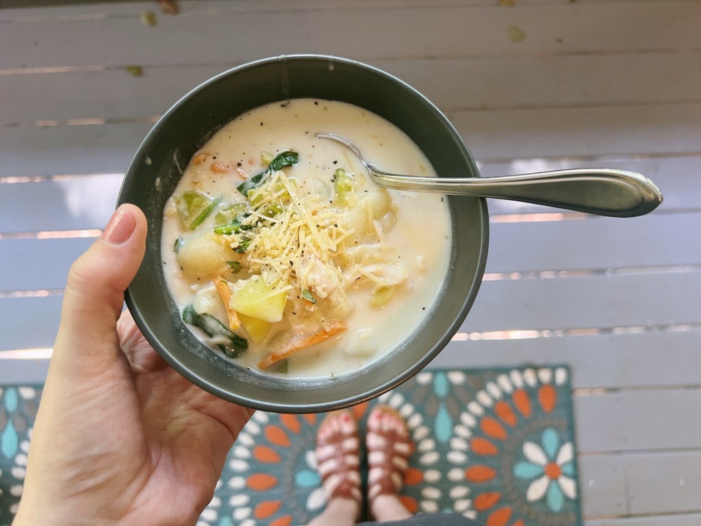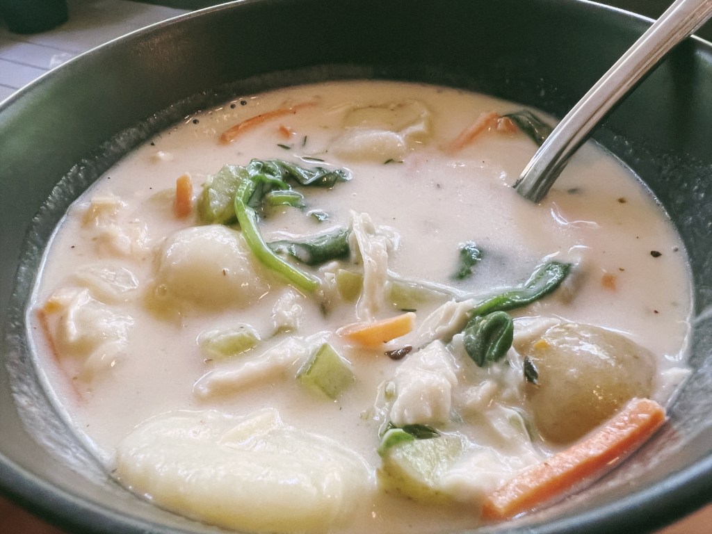 Directions: Sauté the onion, carrots, celery, garlic and finely-diced potatoes in olive oil in a smaller pot or pan. In your large stockpot, melt the butter and add flour. Cook the flour and butter on low for 2-3 minutes stirring frequently, then slowly add the chicken broth and bring to a simmer. To your large pot— Add the sautéed veggies, shredded chicken, fresh thyme and nutmeg. Simmer on low for at least 15 minutes (longer is better). Add the gnocchi and 2 cups water and simmer for another 5-10 minutes. Turn off heat. Add 3-4 heaping handfuls of fresh spinach and wilt into the soup. Add Half & Half slowly. Salt and pepper to taste. Serve in bowls topped with shredded Parmesan. I recommend warm crusty buttered bread for dipping.
