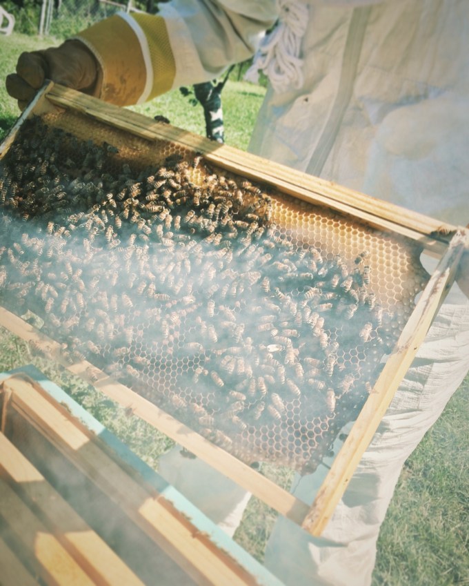 My mom came along to meet the hive, and here she is holding a frame of bees for the first time even though it made her a bit nervous. She is brave!